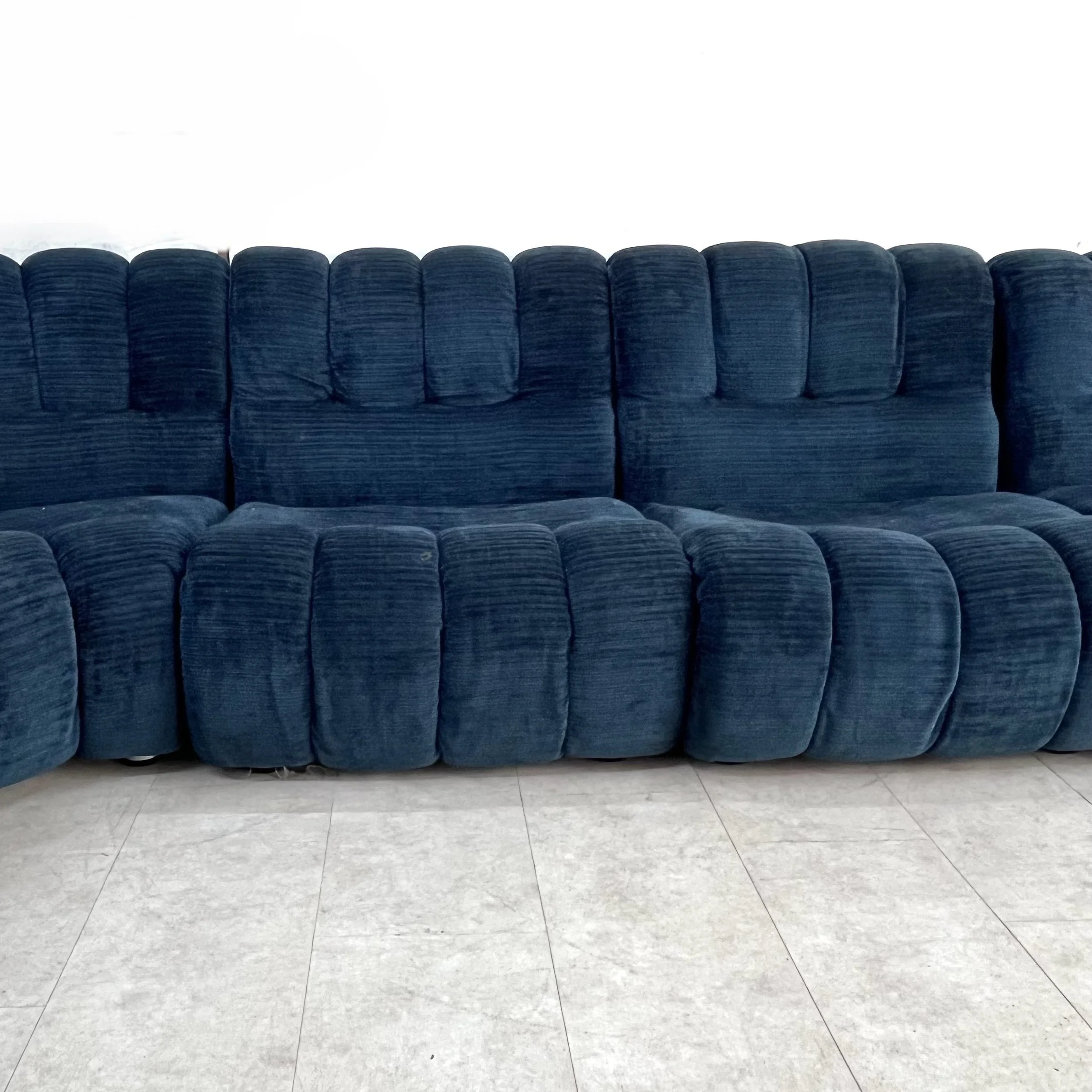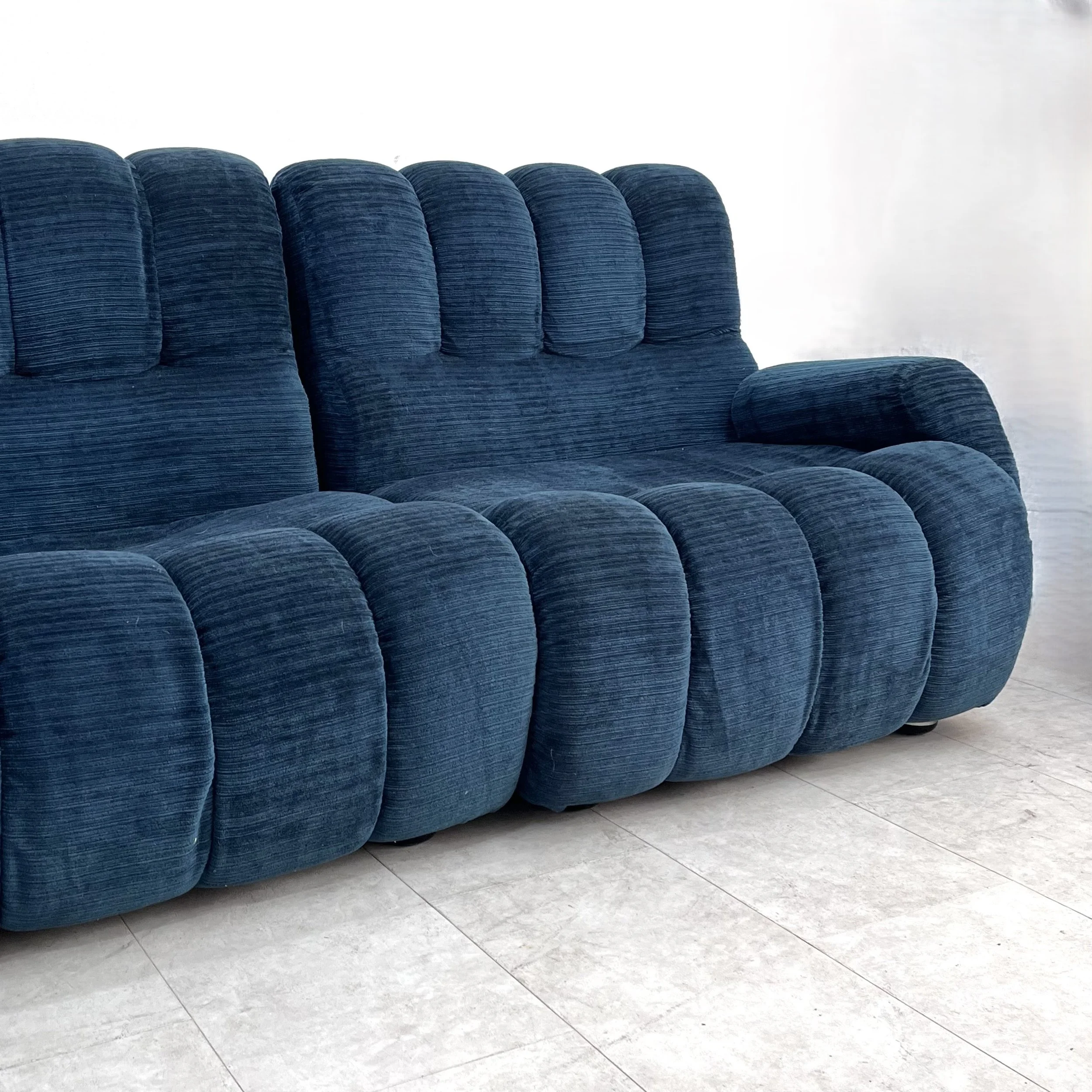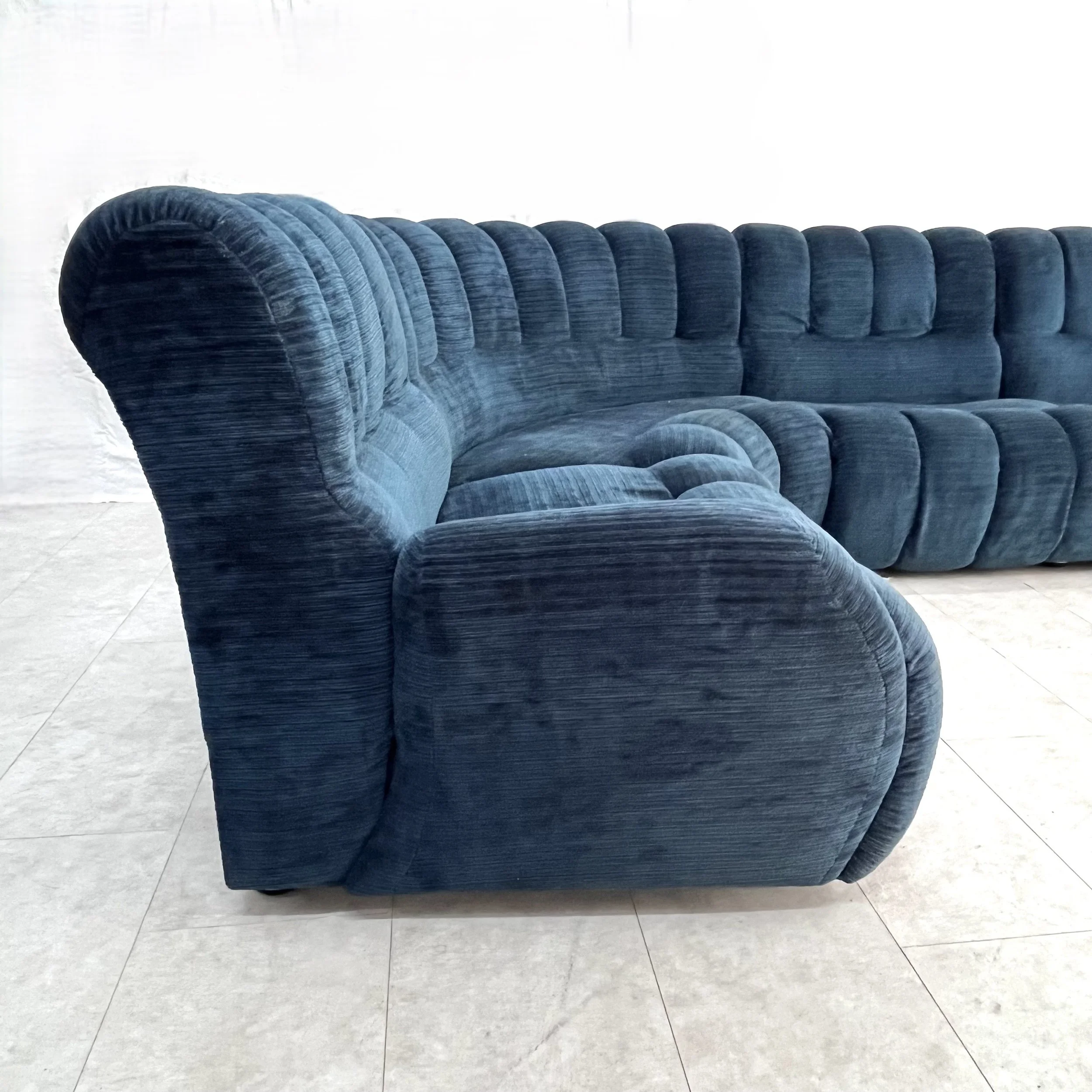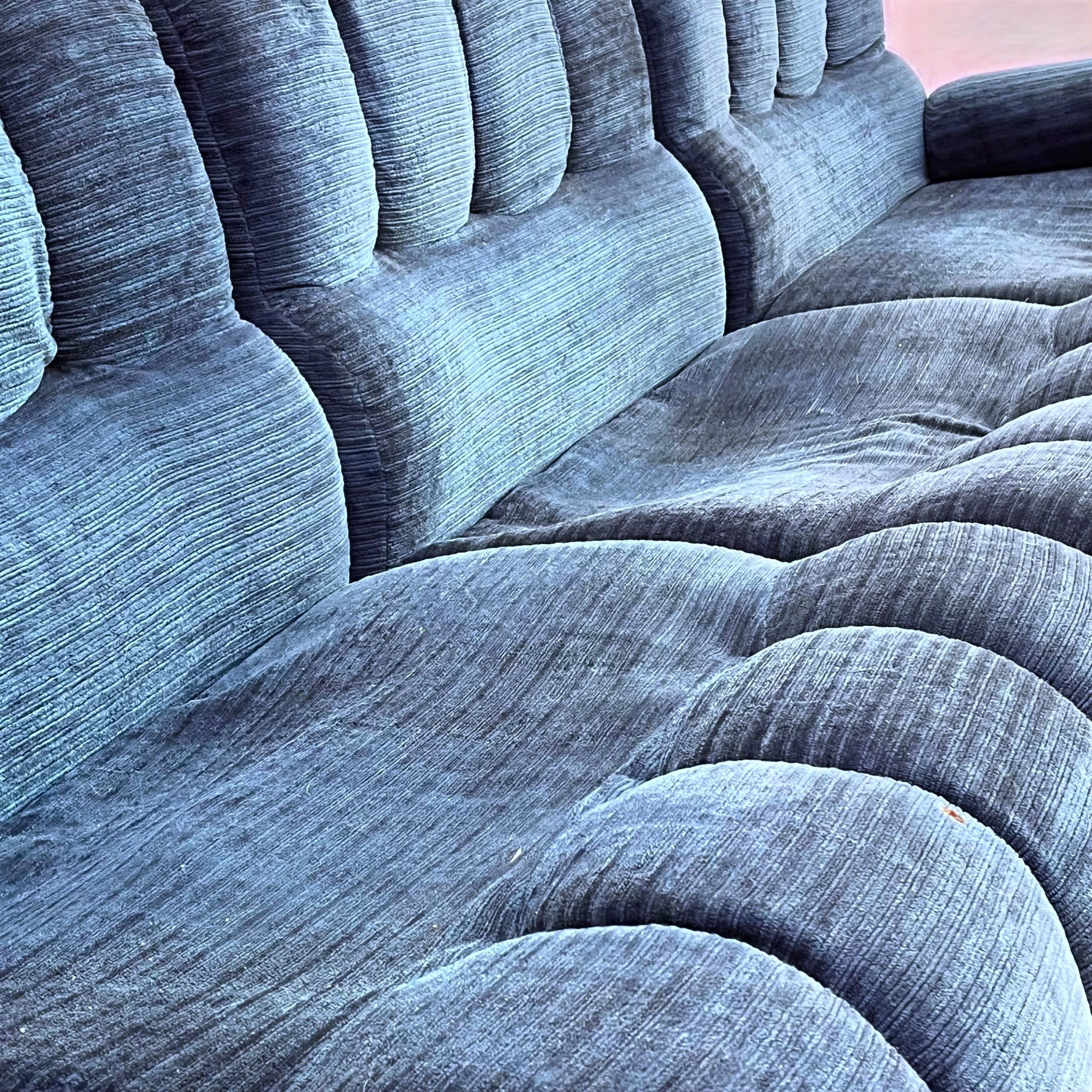Il divano è composto da cinque moduli principali, che possono essere combinati e disposti in vari modi per adattarsi a diversi spazi e creare configurazioni personalizzate. La forma curva del divano è una caratteristica distintiva degli anni '70, conferendo al pezzo un aspetto morbido e accogliente. Il rivestimento in velluto blu aggiunge un tocco di eleganza e lusso al divano, creando un'atmosfera sofisticata. Le sedute sono ampie e imbottite, offrendo un comfort ottimale e invitando al relax. La poltrona coordinata completa l'insieme, creando un angolo di conversazione accogliente e raffinato.