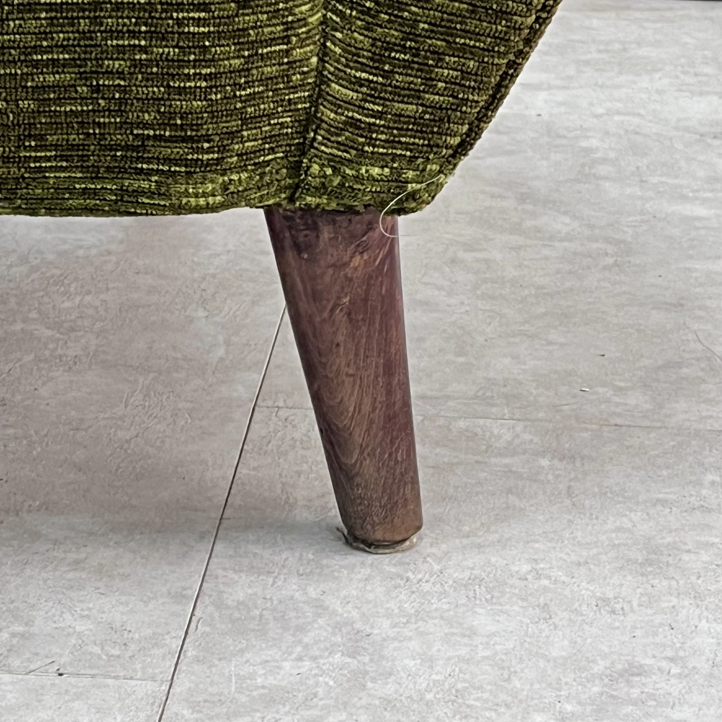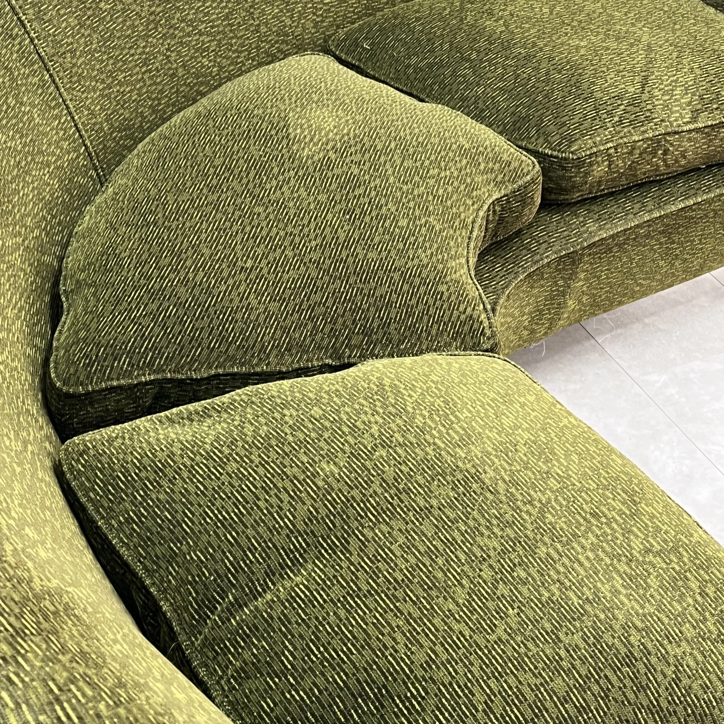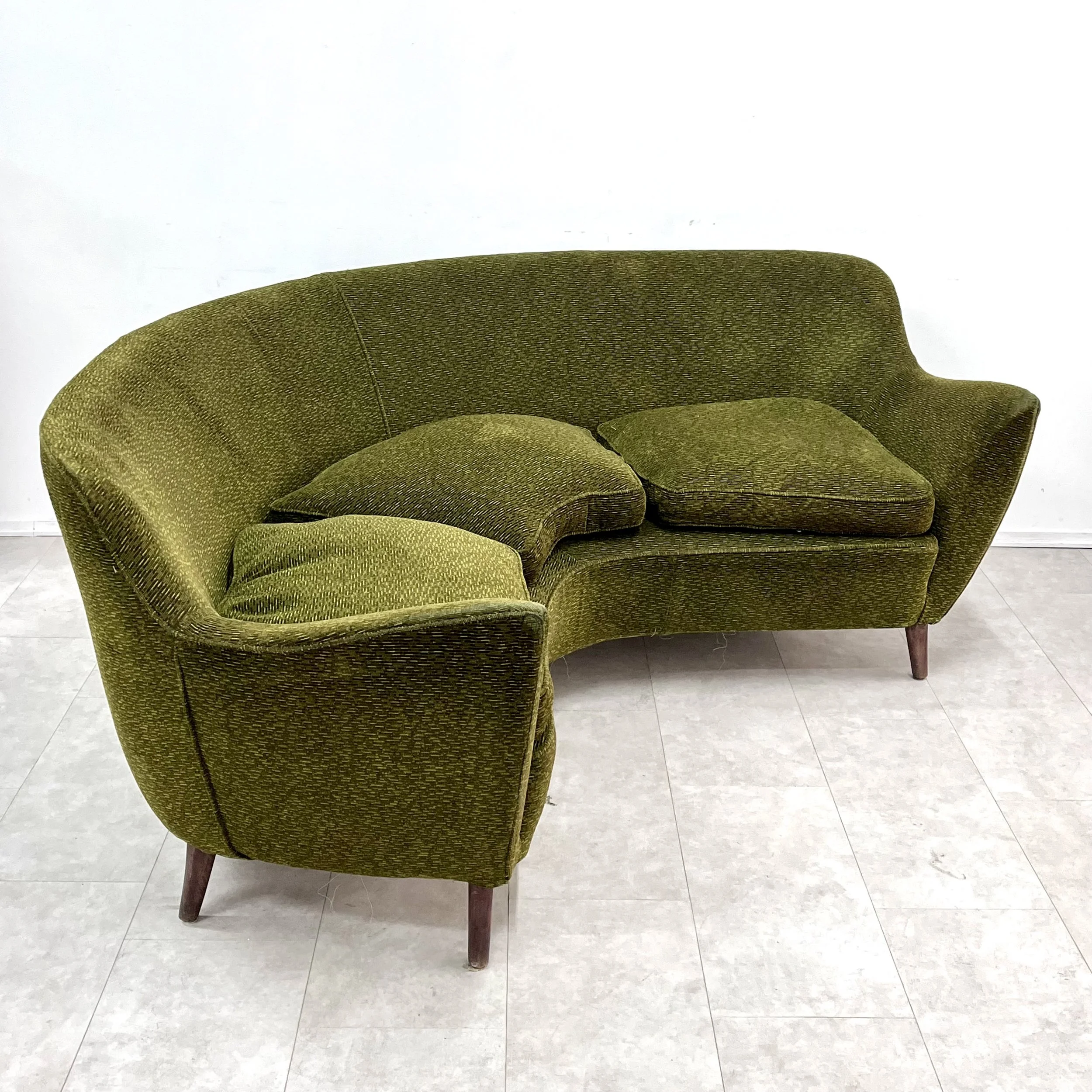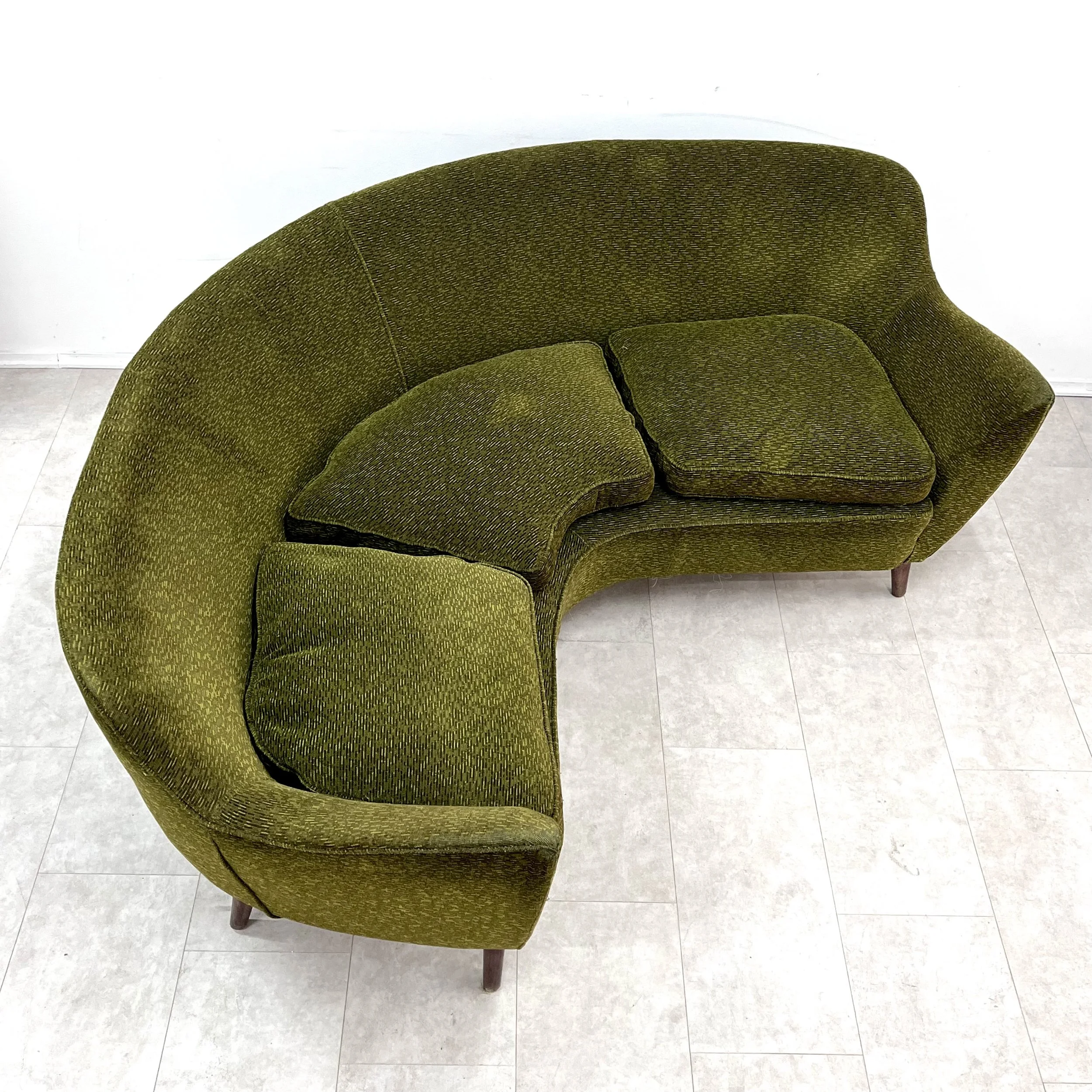 Il divano presenta una forma curva, avvolgente e accogliente. Questa caratteristica lo rende un pezzo unico e distintivo nel panorama del design italiano del periodo. La struttura è in legno massello, un materiale robusto e duraturo che garantisce la stabilità del divano nel tempo. Il rivestimento in velluto verde conferisce al divano un aspetto elegante e raffinato. Il velluto è un tessuto pregiato, morbido al tatto e visivamente piacevole. Il colore verde, inoltre, aggiunge un tocco di natura e freschezza all'ambiente. L'imbottitura è generosa e confortevole, invitando al relax e al riposo.