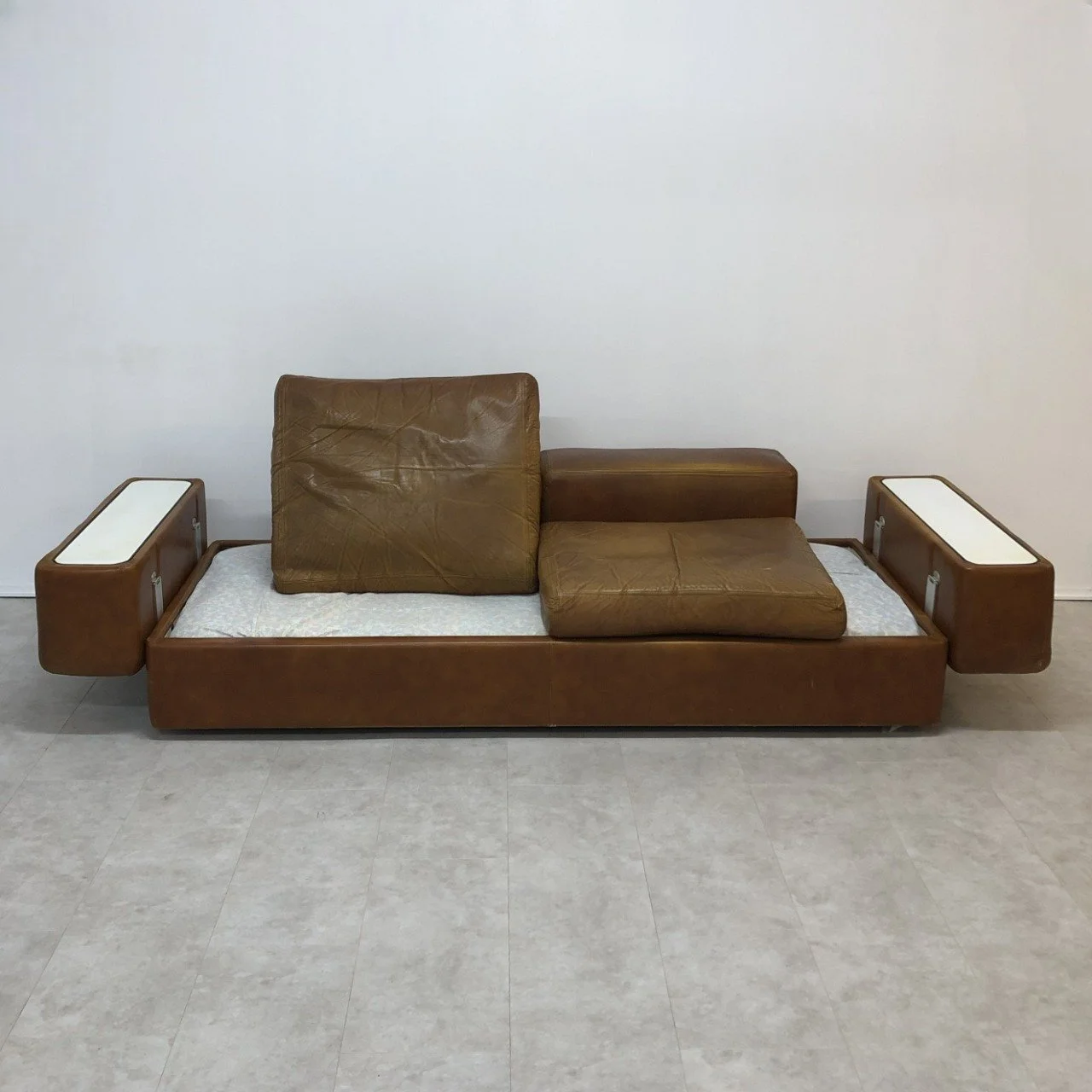 Il design è caratterizzato da linee pulite e squadrate, tipiche del periodo mid-century modern. La struttura è essenziale e funzionale, con un'attenzione particolare all'integrazione degli elementi. La presenza dei braccioli con ripiani laterali in materiale plastico aggiunge un tocco di originalità e funzionalità, trasformandoli in pratici tavolini. Il rivestimento in pelle conferisce al divano un aspetto lussuoso e invecchia con eleganza. La caratteristica principale di questo divano è la sua versatilità: di giorno può essere utilizzato come divano, mentre di notte può essere trasformato in un letto singolo o doppio, a seconda delle dimensioni. Il meccanismo di trasformazione è solitamente semplice e intuitivo.