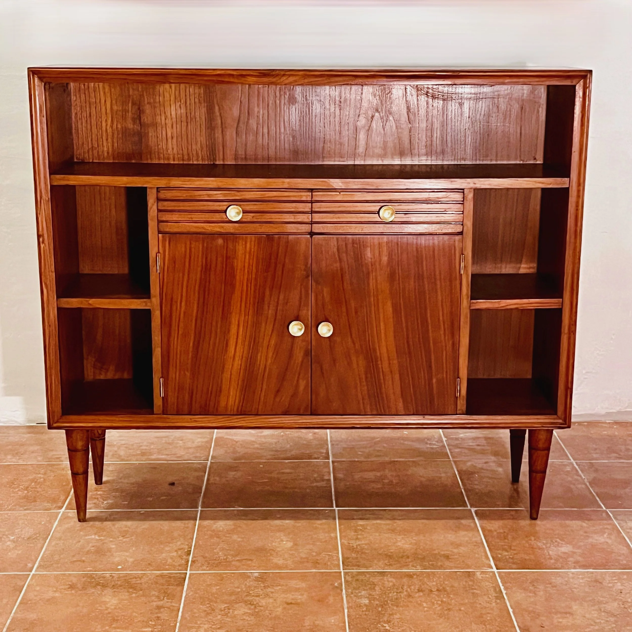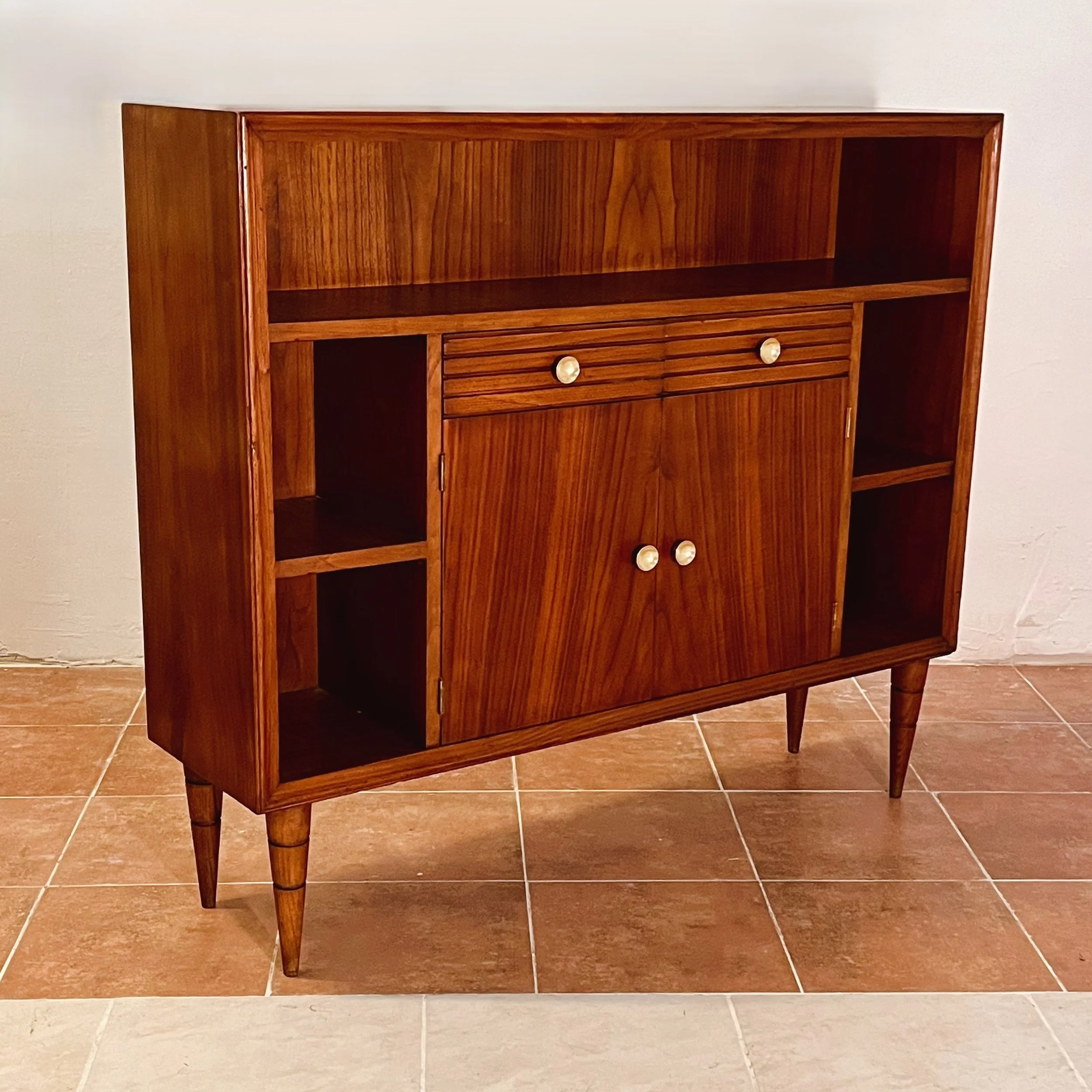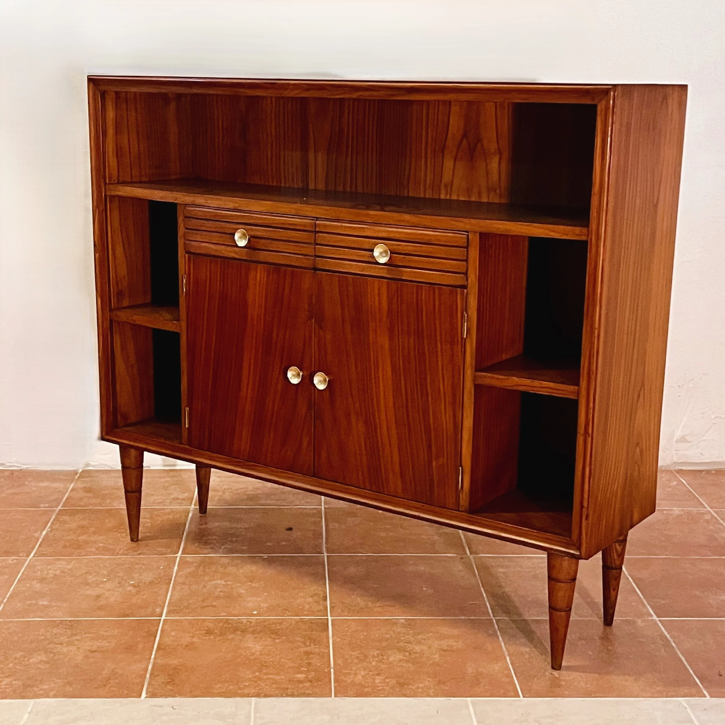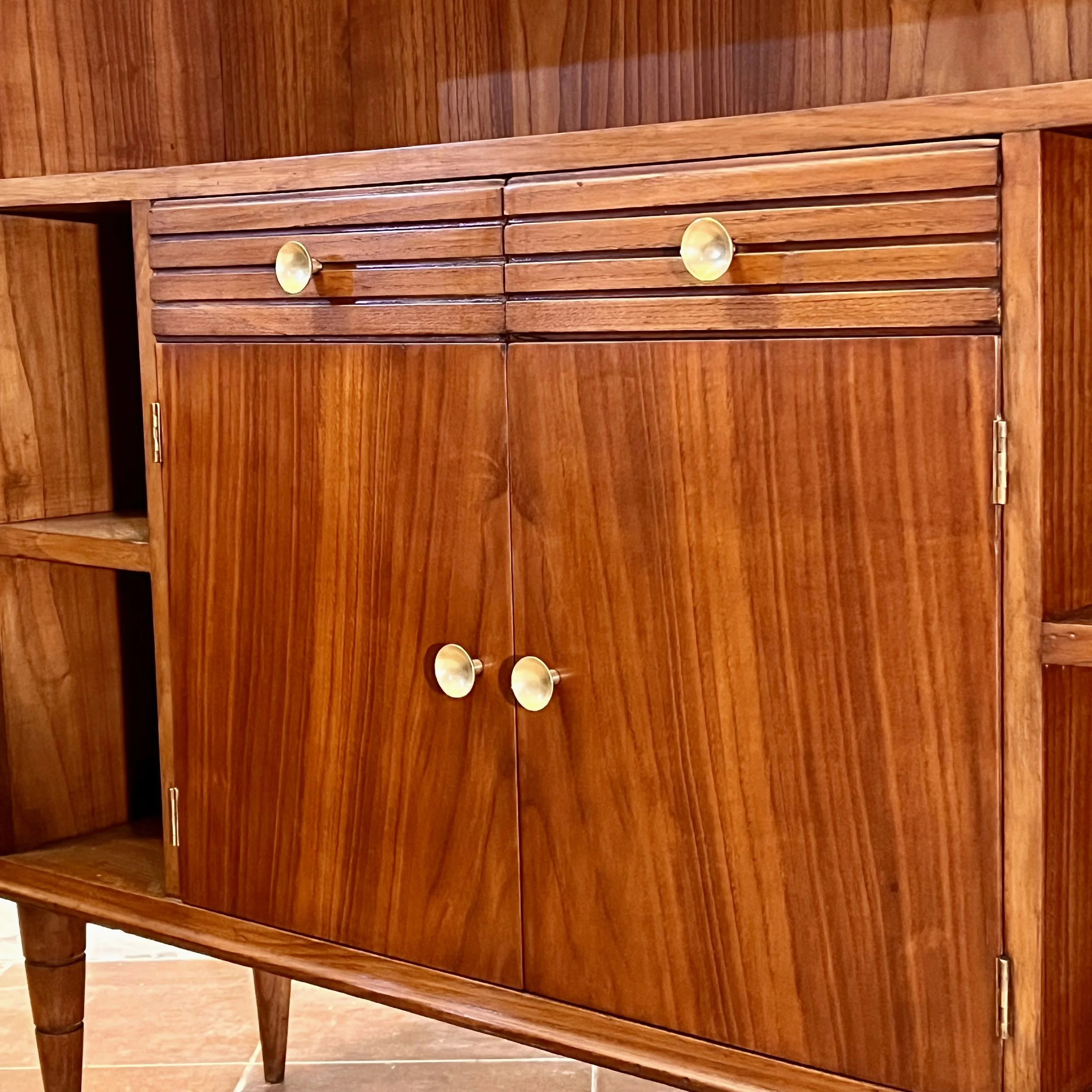 Questo raffinato mobile contenitore/credenza italiano degli anni '40, attribuito a Pier Luigi Colli, è una testimonianza dell'eccellenza ebanistica e del design Mid-Century. Realizzato in sontuoso legno di noce, presenta due vani a giorno superiori e una sezione inferiore con un ripiano scanalato, due cassetti con pomelli e inserti in ottone, e due ante battenti. Poggia su quattro esili piedi affusolati con anelli decorativi in ottone. Versatile e di grande impatto, aggiunge eleganza e storia a qualsiasi ambiente.