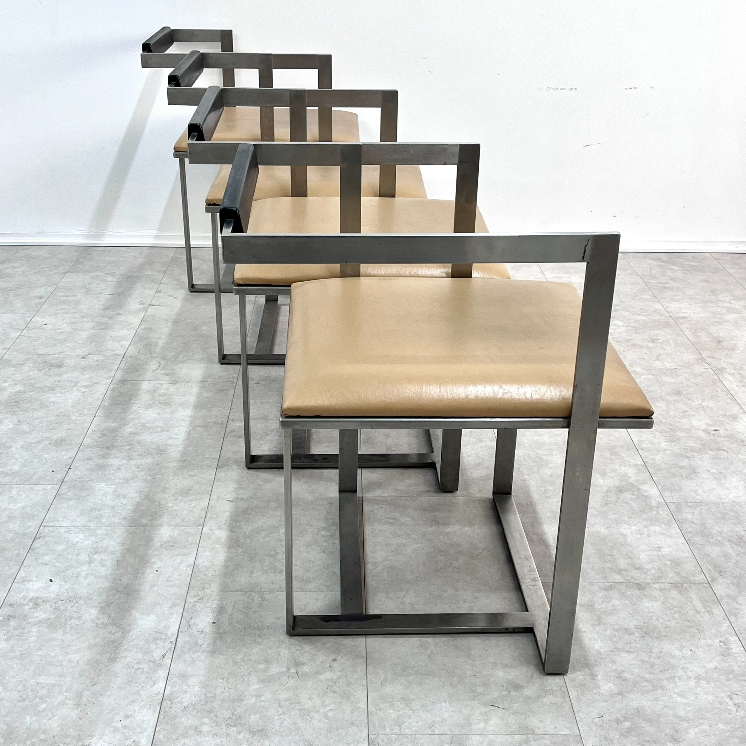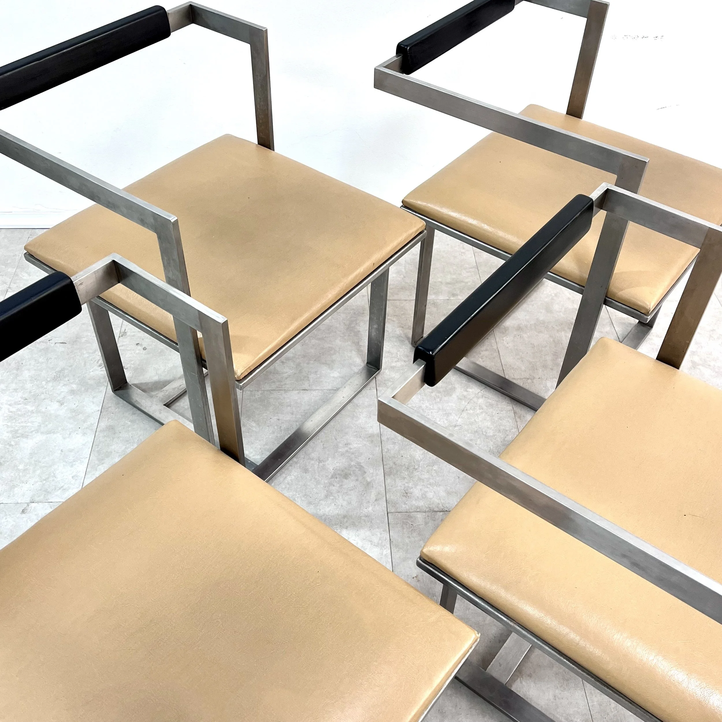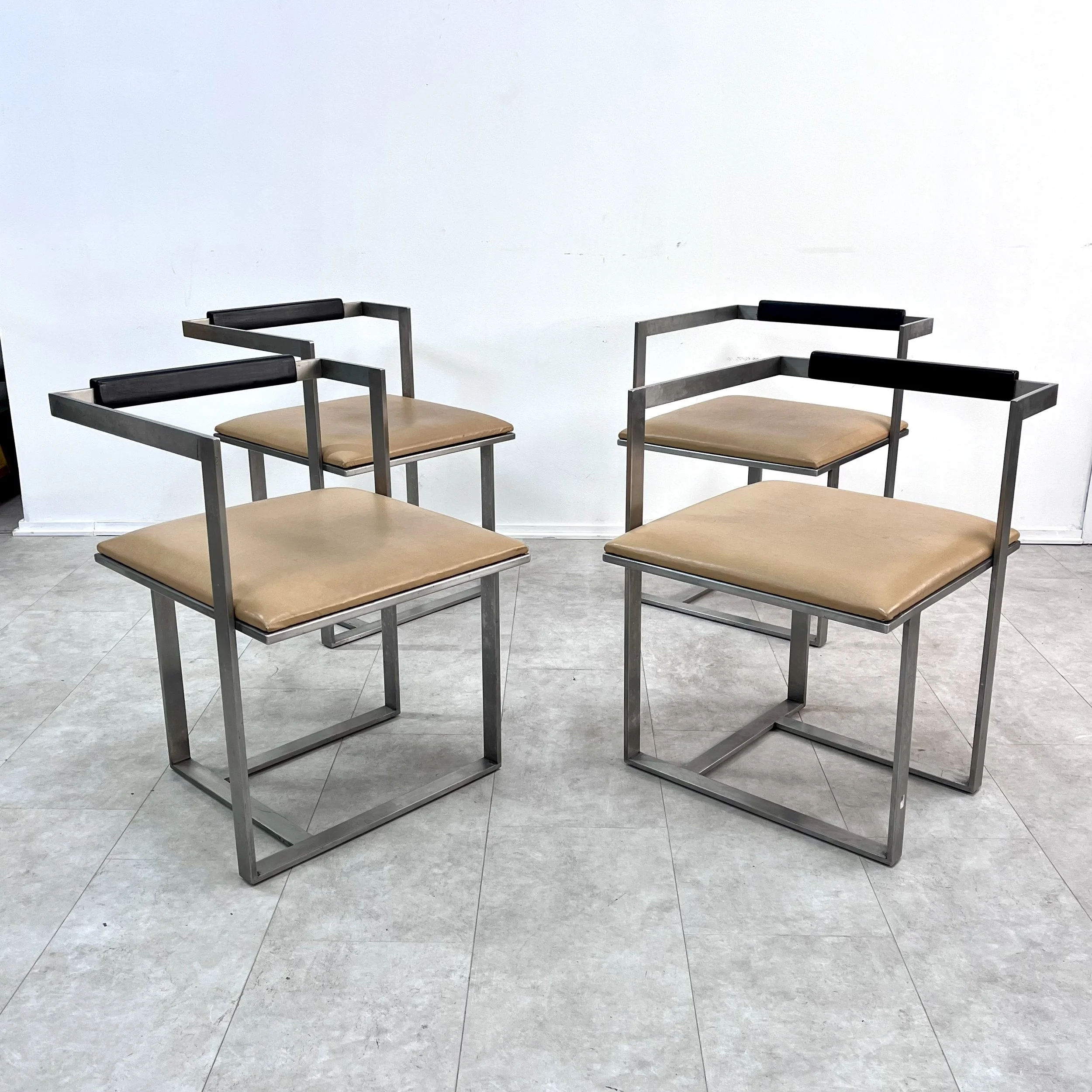 Set di 4 sedie in acciaio e pelle attribuite a Mario Botta, anni '80.