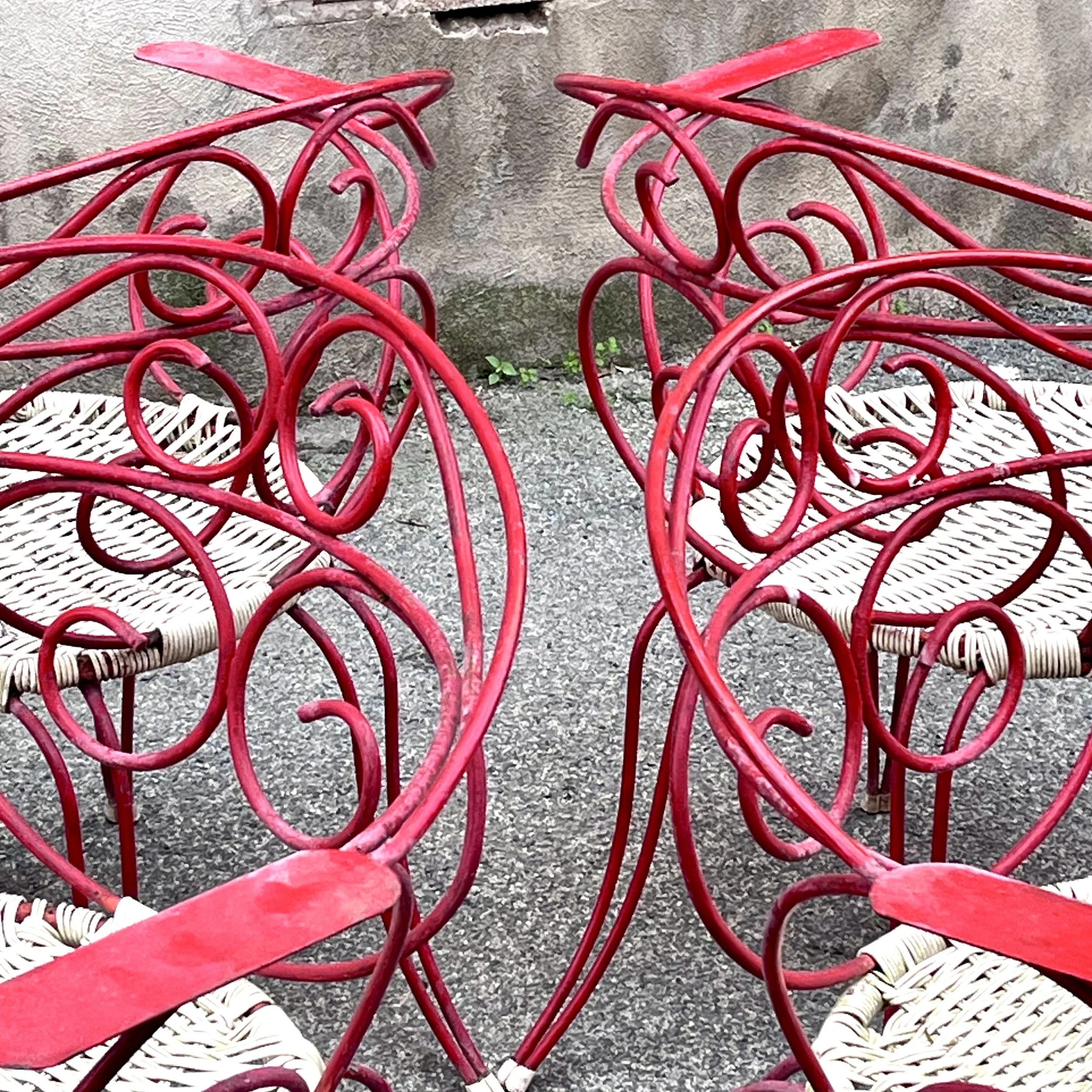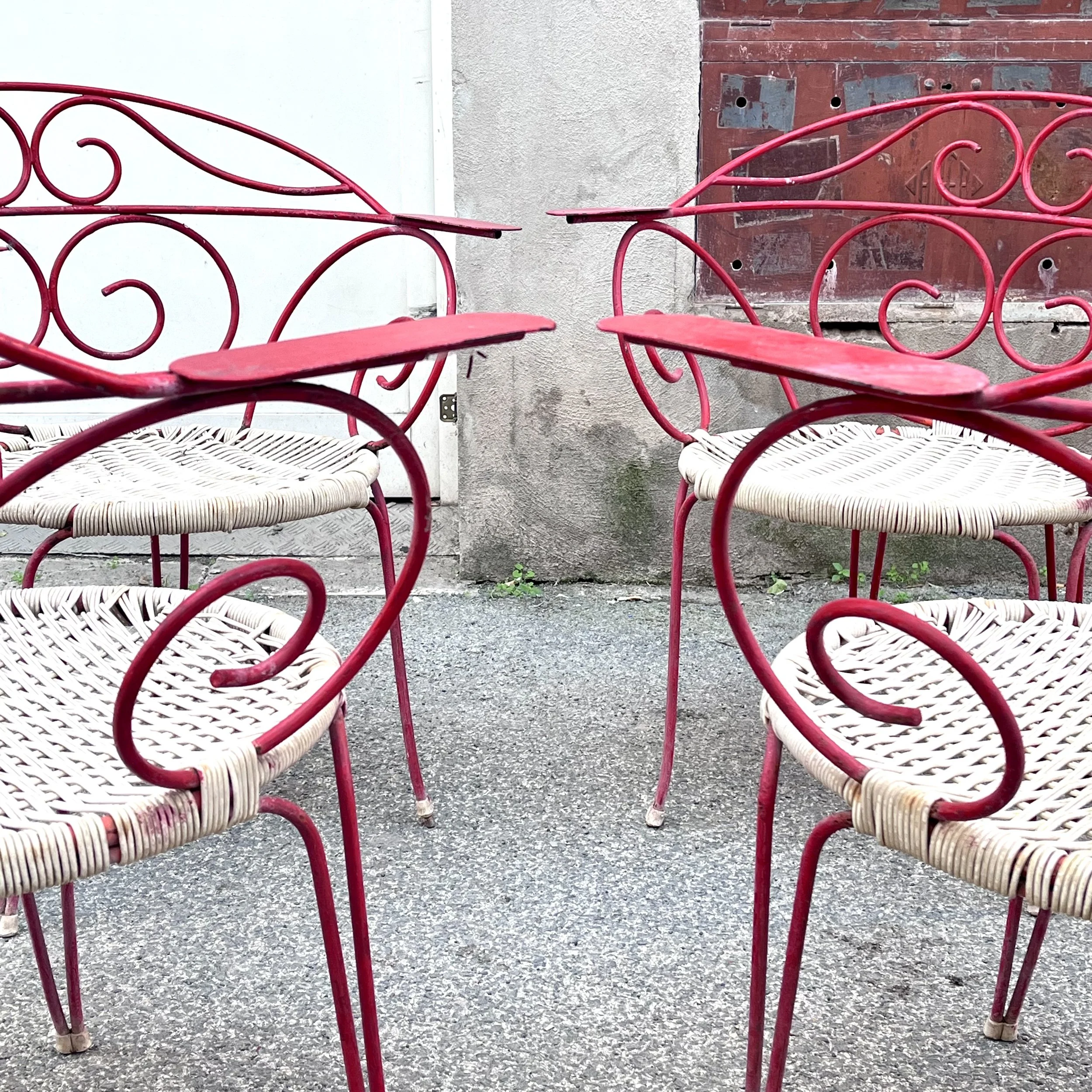 Il telaio di queste sedie è realizzato in metallo e presenta una finitura laccata di un bel colore rosso acceso. Questo tipo di struttura era molto comune negli arredi da esterno dell'epoca, in quanto resistente agli agenti atmosferici e facile da pulire. La seduta e lo schienale sono realizzati in plastica intrecciata, un materiale leggero e flessibile che offriva un buon comfort e un'estetica fresca e moderna. Le linee delle sedie sono molto slanciate e presentano curve sinuose, che conferiscono all'insieme un aspetto elegante.