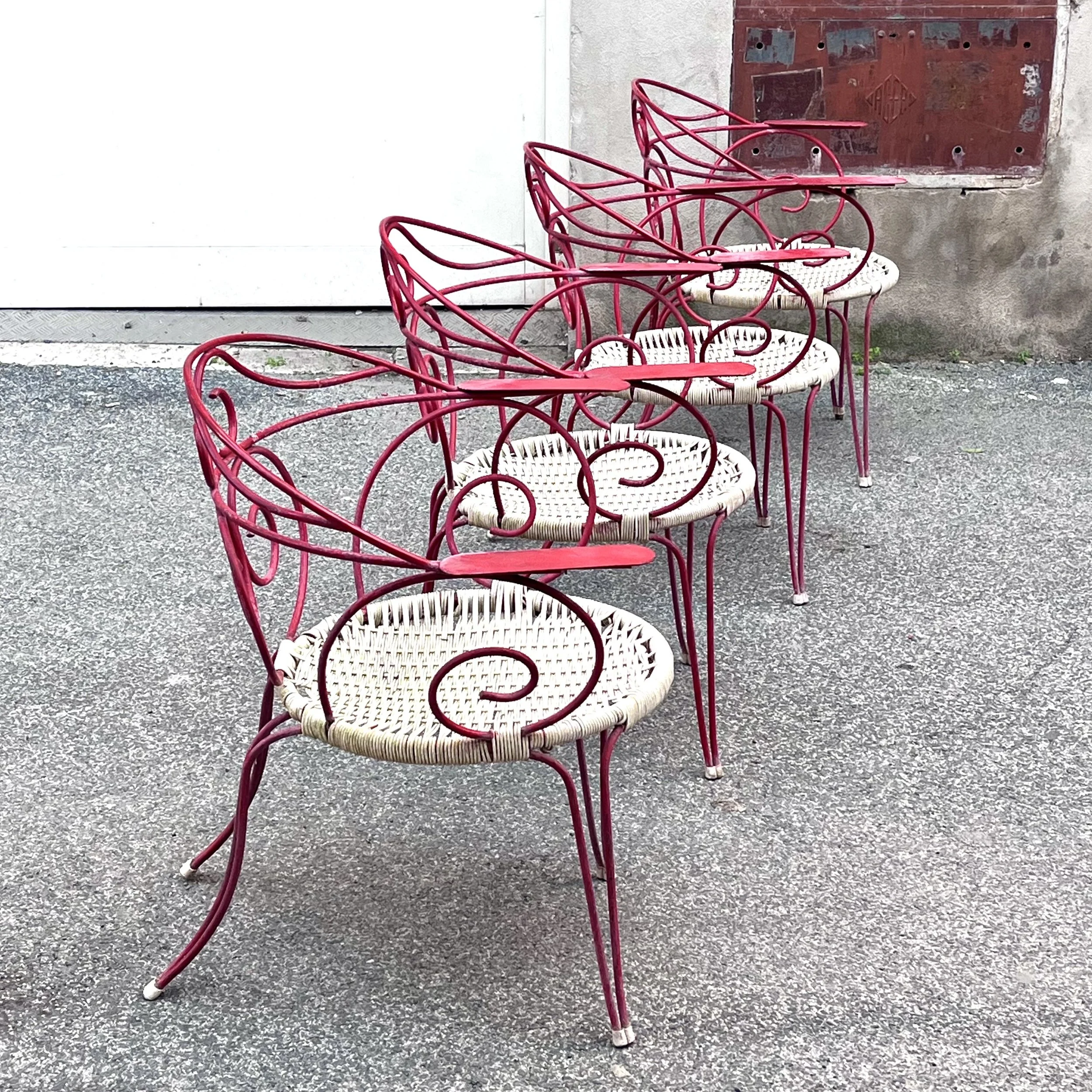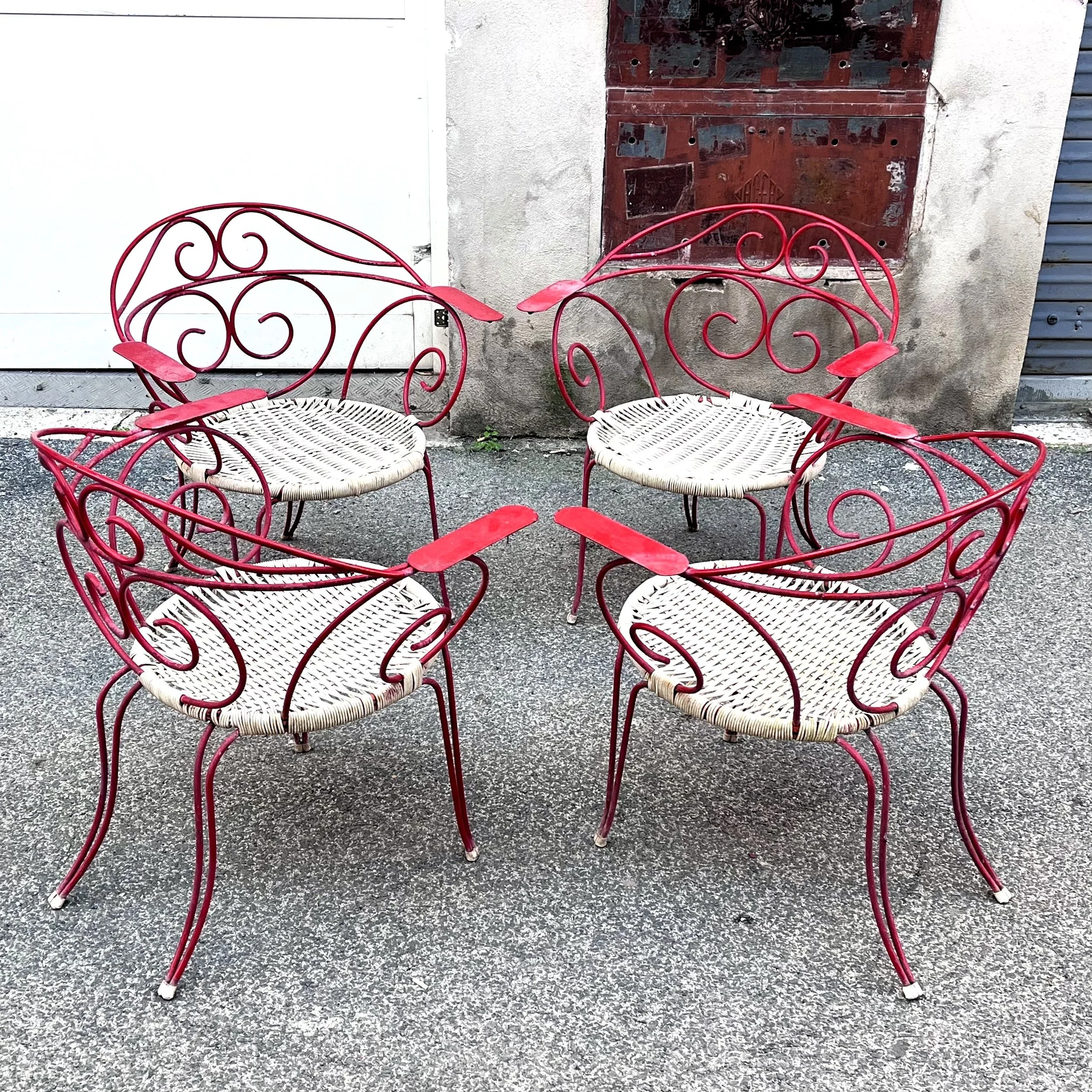 Set di 4 sedie da esterno, struttura in metallo laccato, seduta in plastica intrecciata, anni '60.
